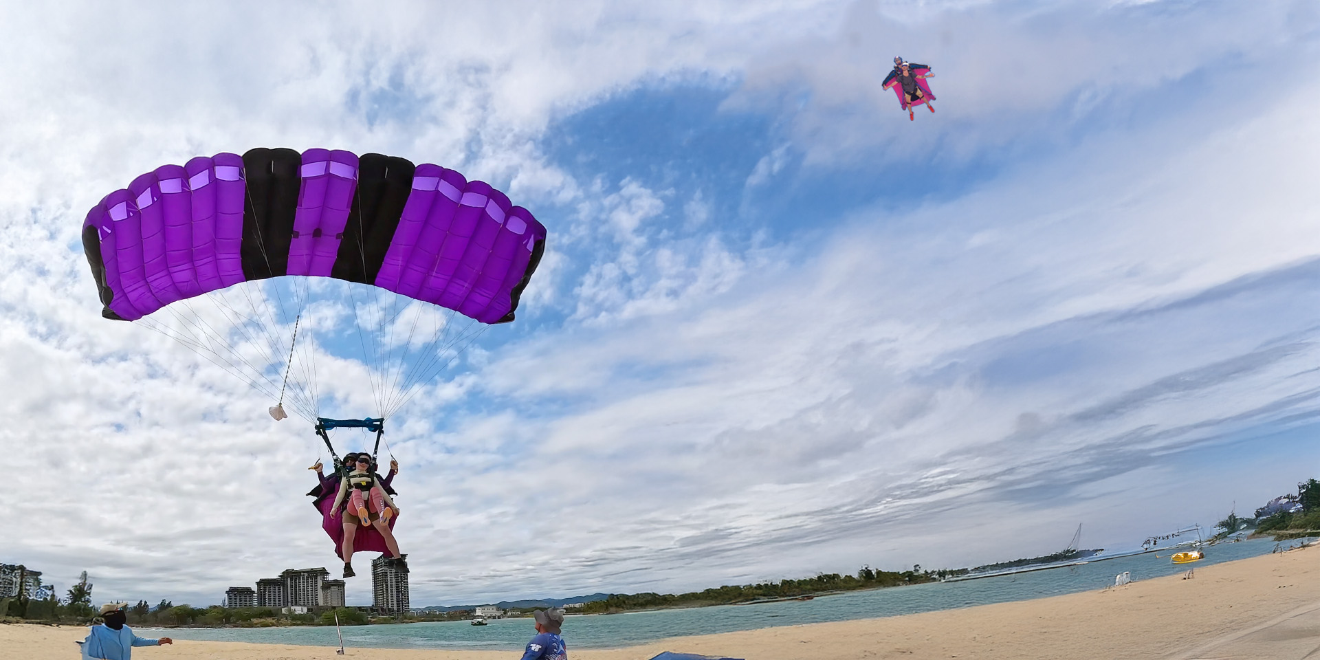 Deployment at 4,000ft. A serene 5-minute canopy ride down to a white sand beach landing.